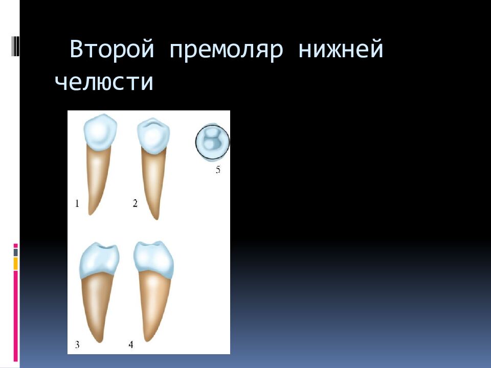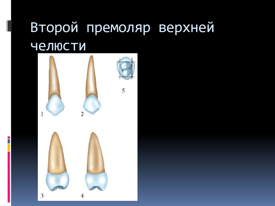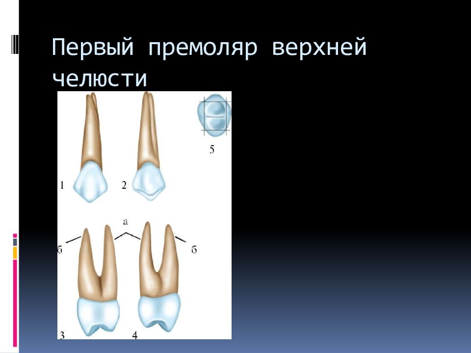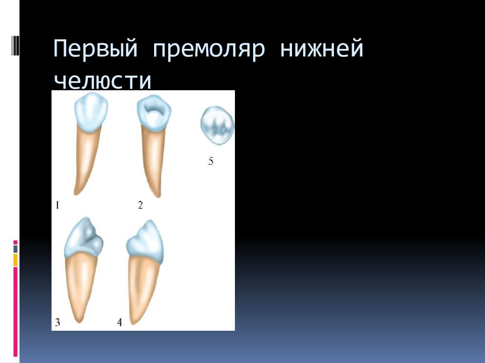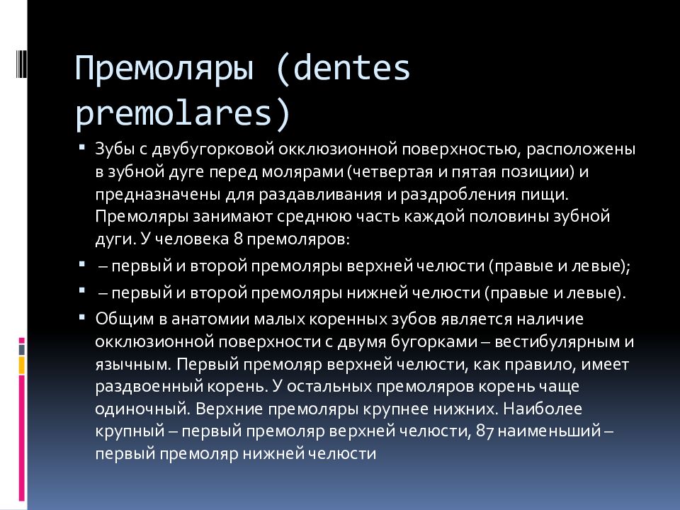 Зубы с двубугорковой окклюзионной поверхностью, расположены в зубной дуге перед молярами (четвертая и пятая позиции) и предназначены для раздавливания и раздробления пищи. Премоляры занимают среднюю часть каждой половины зубной дуги. У человека 8 премоляров : – первый и второй премоляры верхней челюсти (правые и левые ); – первый и второй премоляры нижней челюсти (правые и левые). Общим в анатомии малых коренных зубов является наличие окклюзионной поверхности с двумя бугорками – вестибулярным и язычным. Первый премоляр верхней челюсти, как правило, имеет раздвоенный корень. У остальных премоляров корень чаще одиночный. Верхние премоляры крупнее нижних. Наиболее крупный – первый премоляр верхней челюсти, 87 наименьший – первый премоляр нижней челюсти