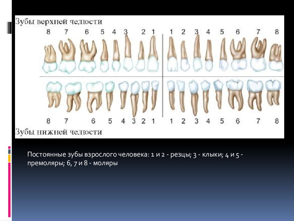 Постоянные зубы взрослого человека: 1 и 2 - резцы; 3 - клыки; 4 и 5 - премоляры ; 6, 7 и 8 - моляры