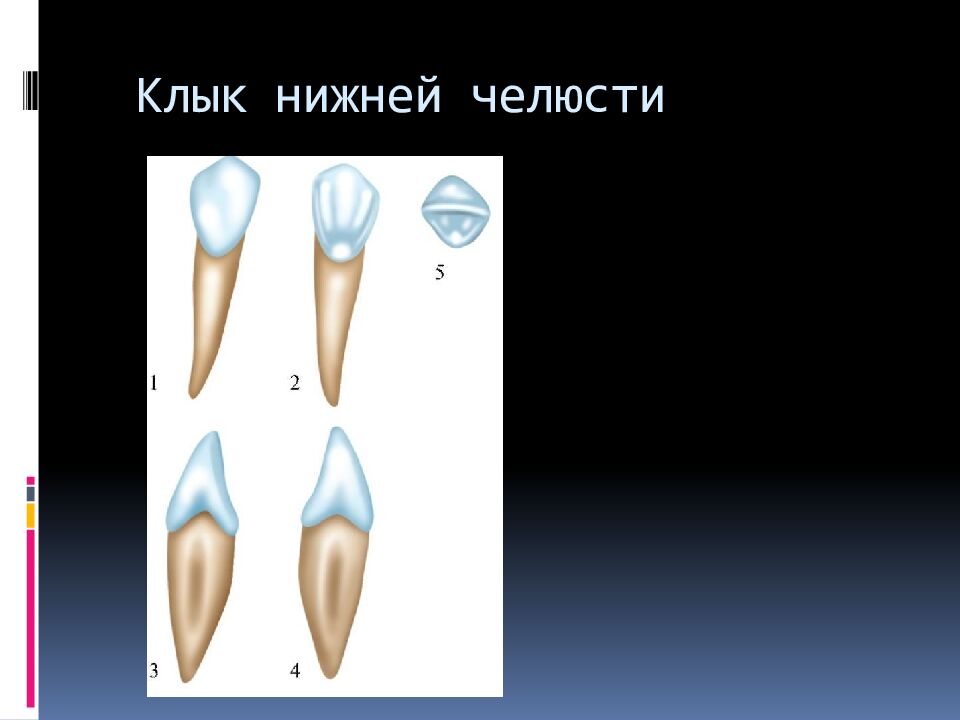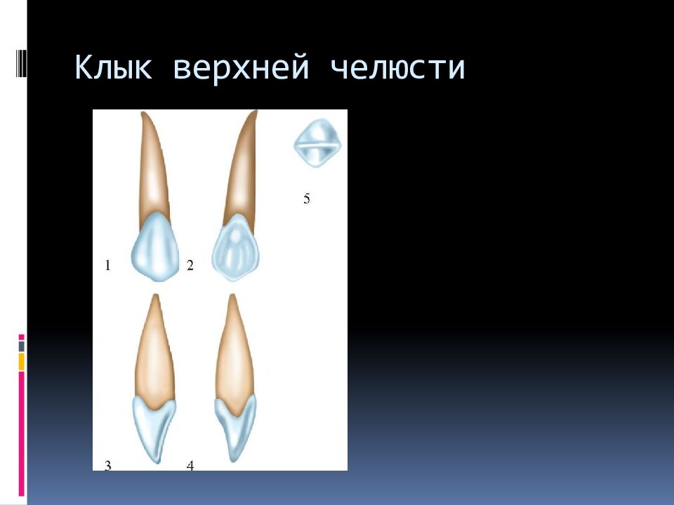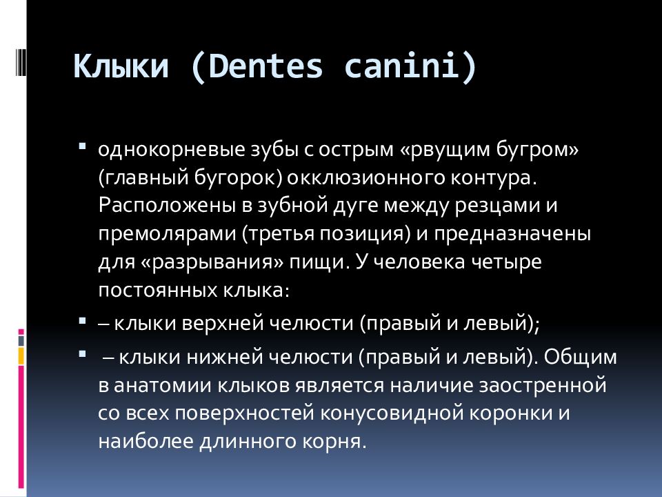 однокорневые зубы с острым «рвущим бугром» (главный бугорок) окклюзионного контура. Расположены в зубной дуге между резцами и премолярами (третья позиция) и предназначены для «разрывания» пищи. У человека четыре постоянных клыка: – клыки верхней челюсти (правый и левый ); – клыки нижней челюсти (правый и левый). Общим в анатомии клыков является наличие заостренной со всех поверхностей конусовидной коронки и наиболее длинного корня.