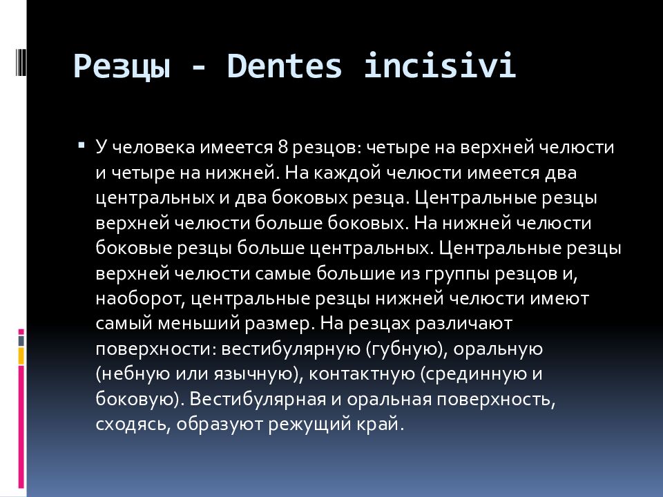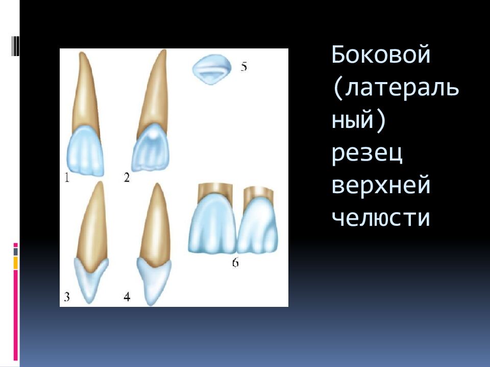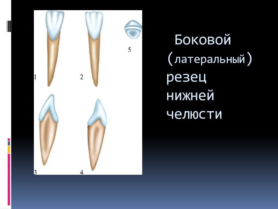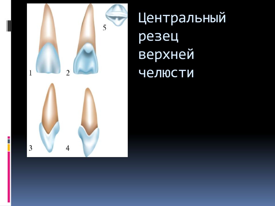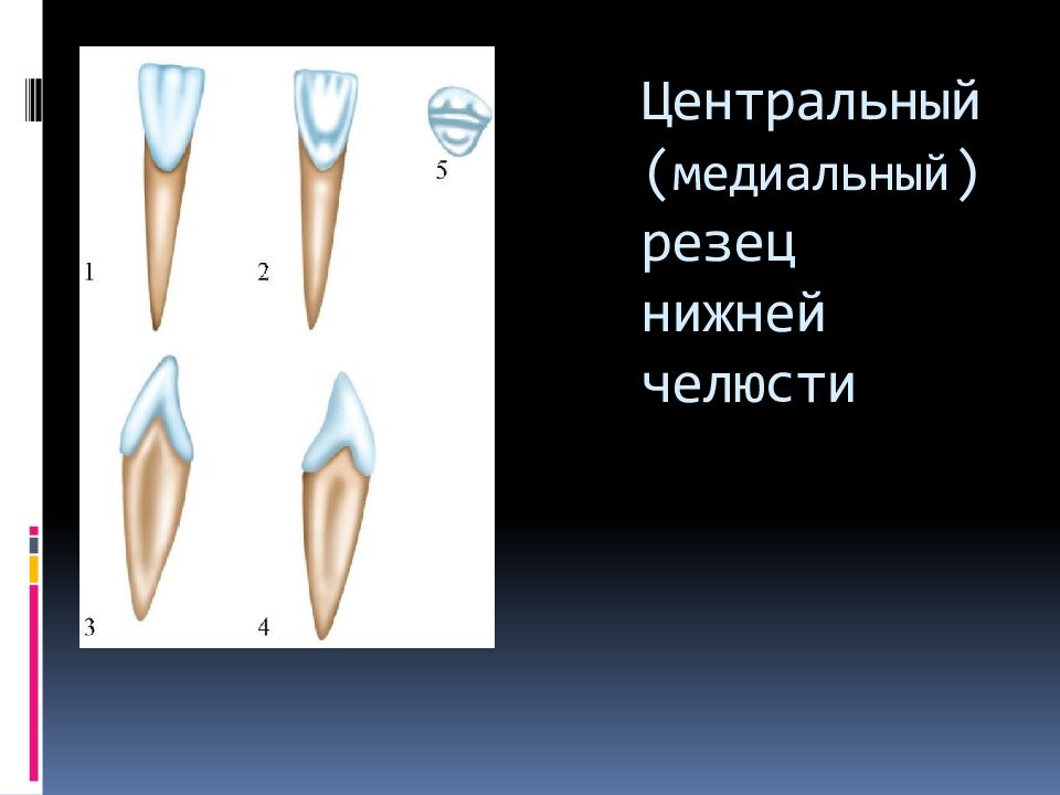 У человека имеется 8 резцов: четыре на верхней челюсти и четыре на нижней. На каждой челюсти имеется два центральных и два боковых резца. Центральные резцы верхней челюсти больше боковых. На нижней челюсти боковые резцы больше центральных. Центральные резцы верхней челюсти самые большие из группы резцов и, наоборот, центральные резцы нижней челюсти имеют самый меньший размер. На резцах разли чают поверхности: вестибулярную (губную), оральную (небную или язычную), контактную (срединную и боковую). Вестибулярная и оральная поверхность, сходясь, образуют режущий край.