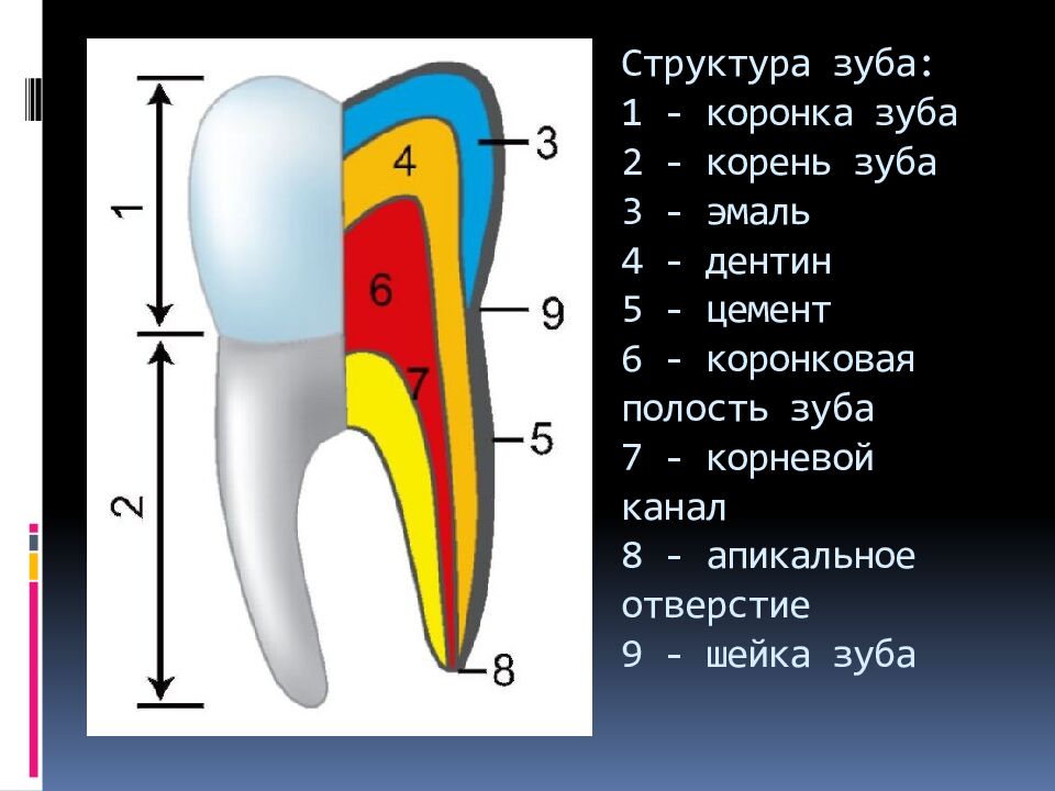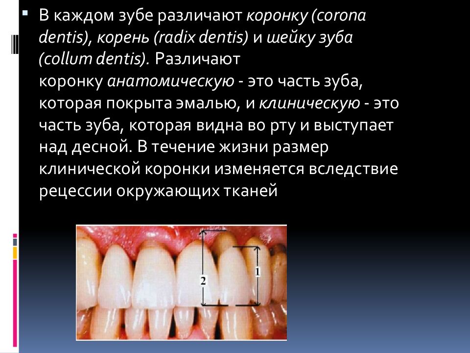 В каждом зубе различают коронку ( corona dentis ), корень ( radix dentis ) и шейку зуба ( collum dentis ). Различают коронку анатомическую - это часть зуба, которая покрыта эмалью, и клиническую - это часть зуба, которая видна во рту и выступает над десной. В течение жизни размер клинической коронки изменяется вследствие рецессии окружающих тканей