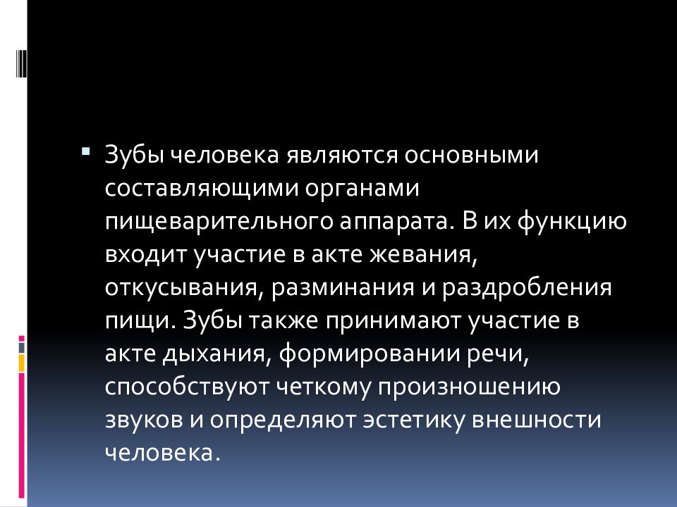 Зубы человека являются основными составляющими органами пищеварительного аппарата. В их функцию входит участие в акте жевания, откусывания, разминания и раздробления пищи. Зубы также принимают участие в акте дыхания, формировании речи, способствуют четкому произношению звуков и определяют эстетику внешности человека.