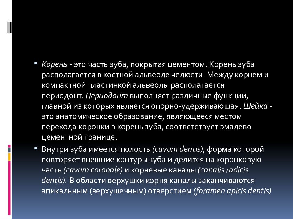 Корень - это часть зуба, покрытая цементом. Корень зуба располагается в костной альвеоле челюсти. Между корнем и компактной пластинкой альвеолы располагается периодонт. Периодонт выполняет различные функции, главной из которых является опорно-удерживающая. Шейка - это анатомическое образование, являющееся местом перехода коронки в корень зуба, соответствует эмалево-цементной границе. Внутри зуба имеется полость ( cavum dentis ), форма которой повторяет внешние контуры зуба и делится на коронковую часть ( cavum coronale ) и корневые каналы ( canalis radicis dentis ). В области верхушки корня каналы заканчиваются апикальным (верхушечным) отверстием ( foramen apicis dentis )