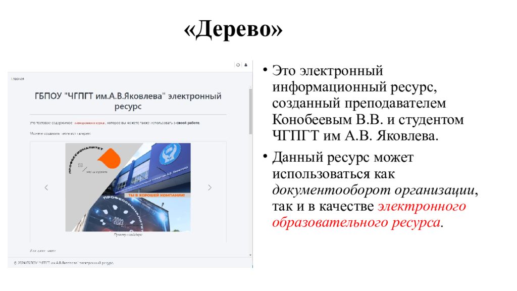 Это электронный информационный ресурс, созданный преподавателем Конобеевым В.В. и студентом ЧГПГТ им А.В. Яковлева. Данный ресурс может использоваться как документооборот организации, так и в качестве электронного образовательного ресурса.