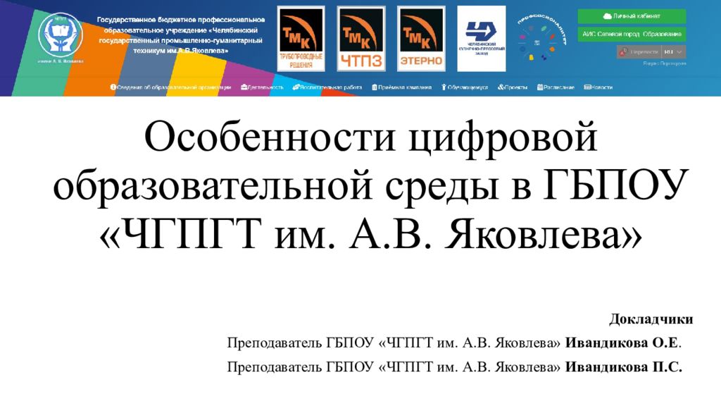 Первый слайд презентации: Особенности цифровой образовательной среды в ГБПОУ «ЧГПГТ им. А.В. Яковлева»