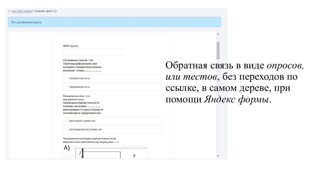 Обратная связь в виде опросов, или тестов, без переходов по ссылке, в самом дереве, при помощи Яндекс формы.