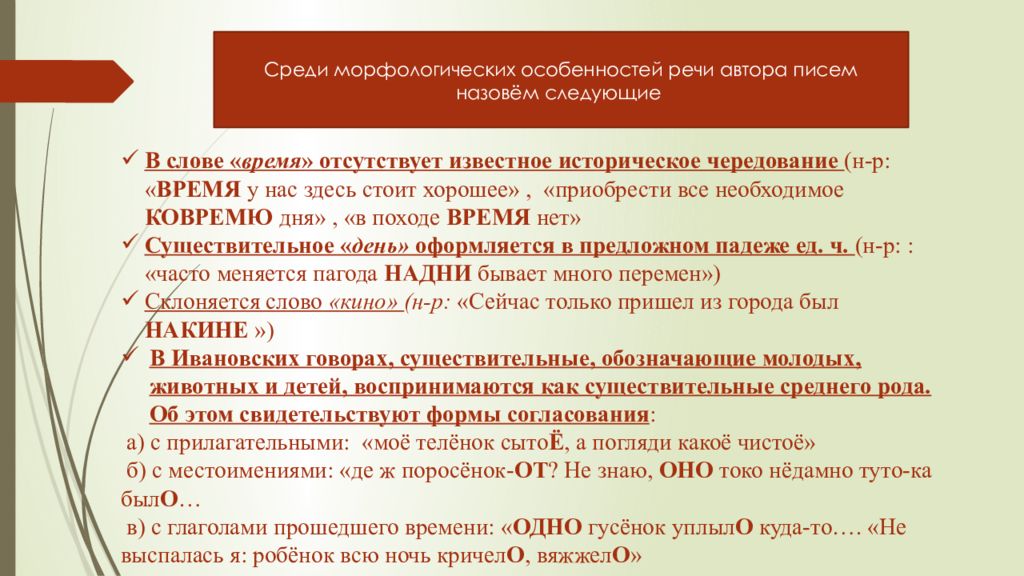 Среди морфологических особенностей речи автора писем назовём следующие В слове « время » отсутствует известное историческое чередование (н-р: « ВРЕМЯ у нас здесь стоит хорошее», «приобрести все необходимое КОВРЕМЮ дня», «в походе ВРЕМЯ нет» Существительное « день» оформляется в предложном падеже ед. ч. (н-р: : «часто меняется пагода НАДНИ бывает много перемен») Склоняется слово «кино » (н-р: «Сейчас только пришел из города был НАКИНЕ ») В Ивановских говорах, существительные, обозначающие молодых, животных и детей, воспринимаются как существительные среднего рода. Об этом свидетельствуют формы согласования : а) с прилагательными: «моё телёнок сыто Ё, а погляди какоё чистоё » б) с местоимениями: «де ж поросёнок- ОТ ? Не знаю, ОНО токо нёдамно туто -ка был О … в) с глаголами прошедшего времени: « ОДНО гусёнок уплыл О куда-то…. «Не выспалась я: робёнок всю ночь кричел О, вяжжел О »