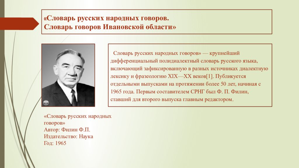 « Словарь русских народных говоров. Словарь говоров Ивановской области» «Словарь русских народных говоров» Автор: Филин Ф.П. Издательство: Наука Год: 1965 « Словарь русских народных говоров» — крупнейший дифференциальный полидиалектный словарь русского языка, включающий зафиксированную в разных источниках диалектную лексику и фразеологию XIX—XX веков[1]. Публикуется отдельными выпусками на протяжении более 50 лет, начиная с 1965 года. Первым составителем СРНГ был Ф. П. Филин, ставший для второго выпуска главным редактором.