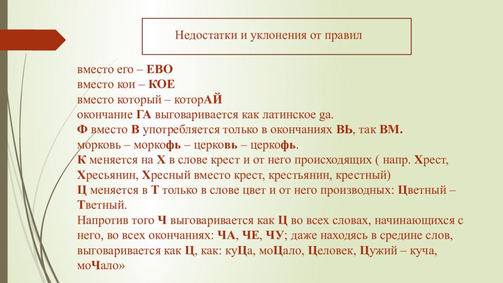 Н едостатки и уклонения от правил вместо его – ЕВО вместо кои – КОЕ вместо который – котор АЙ окончание ГА выговаривается как латинское ga. Ф вместо В употребляется только в окончаниях ВЬ, так ВМ. морковь – морко фь – церко вь – церко фь. К меняется на Х в слове крест и от него происходящих ( напр. Х рест, Х ресьянин, Х ресный вместо крест, крестьянин, крестный) Ц меняется в Т только в слове цвет и от него производных: Ц ветный – Т ветный. Напротив того Ч выговаривается как Ц во всех словах, начинающихся с него, во всех окончаниях: ЧА, ЧЕ, ЧУ ; даже находясь в средине слов, выговаривается как Ц, как: ку Ц а, мо Ц ало, Ц еловек, Ц ужий – куча, мо Ч ало »