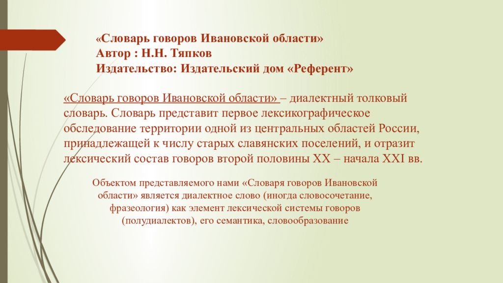 « Словарь говоров Ивановской области» Автор : Н.Н. Тяпков Издательство: Издательский дом «Референт» «Словарь говоров Ивановской области» – диалектный толковый словарь. Словарь представит первое лексикографическое обследование территории одной из центральных областей России, принадлежащей к числу старых славянских поселений, и отразит лексический состав говоров второй половины XX – начала XXI вв. Объектом представляемого нами «Словаря говоров Ивановской области» является диалектное слово (иногда словосочетание, фразеология) как элемент лексической системы говоров ( полудиалектов ), его семантика, словообразование