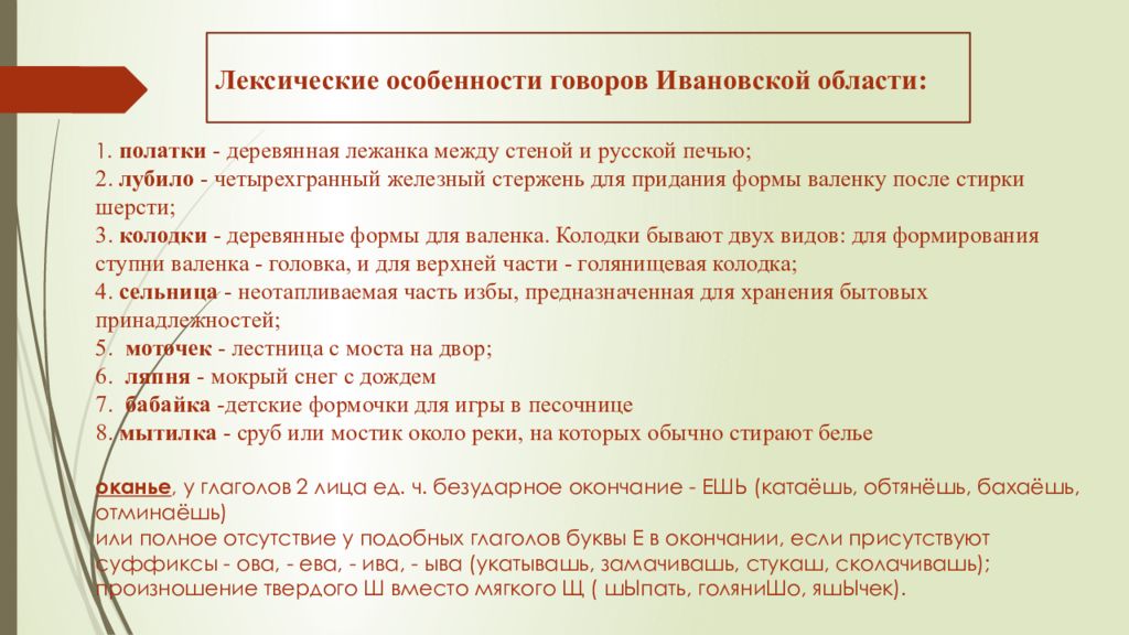 Лексические особенности говоров Ивановской области: 1. полатки - деревянная лежанка между стеной и русской печью; 2. лубило - четырехгранный железный стержень для придания формы валенку после стирки шерсти; 3. колодки - деревянные формы для валенка. Колодки бывают двух видов: для формирования ступни валенка - головка, и для верхней части - голянищевая колодка; 4. сельница - неотапливаемая часть избы, предназначенная для хранения бытовых принадлежностей; 5. моточек - лестница с моста на двор; 6. ляпня - мокрый снег с дождем 7. бабайка -детские формочки для игры в песочнице 8. мытилка - сруб или мостик около реки, на которых обычно стирают белье оканье, у глаголов 2 лица ед. ч. безударное окончание - ЕШЬ ( катаёшь, обтянёшь, бахаёшь, отминаёшь ) или полное отсутствие у подобных глаголов буквы Е в окончании, если присутствуют суффиксы - ова, - ева, - ива, - ыва ( укатывашь, замачивашь, стукаш, сколачивашь ); произношение твердого Ш вместо мягкого Щ ( шЫпать, голяниШо, яшЫчек ).