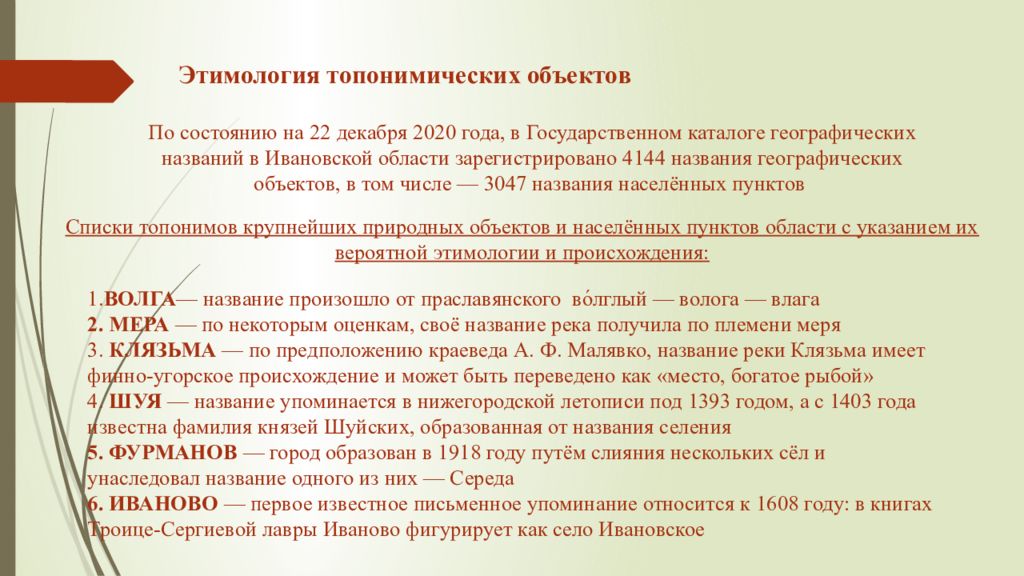 Этимология топонимических объектов По состоянию на 22 декабря 2020 года, в Государственном каталоге географических названий в Ивановской области зарегистрировано 4144 названия географических объектов, в том числе — 3047 названия населённых пунктов С писки топонимов крупнейших природных объектов и населённых пунктов области с указанием их вероятной этимологии и происхождения: 1. ВОЛГА — название произошло от праславянского во́лглый — волога — влага 2. МЕРА — по некоторым оценкам, своё название река получила по племени меря 3. КЛЯЗЬМА — по предположению краеведа А. Ф. Малявко, название реки Клязьма имеет финно-угорское происхождение и может быть переведено как «место, богатое рыбой » 4. ШУЯ — название упоминается в нижегородской летописи под 1393 годом, а с 1403 года известна фамилия князей Шуйских, образованная от названия селения 5. ФУРМАНОВ — город образован в 1918 году путём слияния нескольких сёл и унаследовал название одного из них — Середа 6. ИВАНОВО — первое известное письменное упоминание относится к 1608 году: в книгах Троице-Сергиевой лавры Иваново фигурирует как село Ивановское