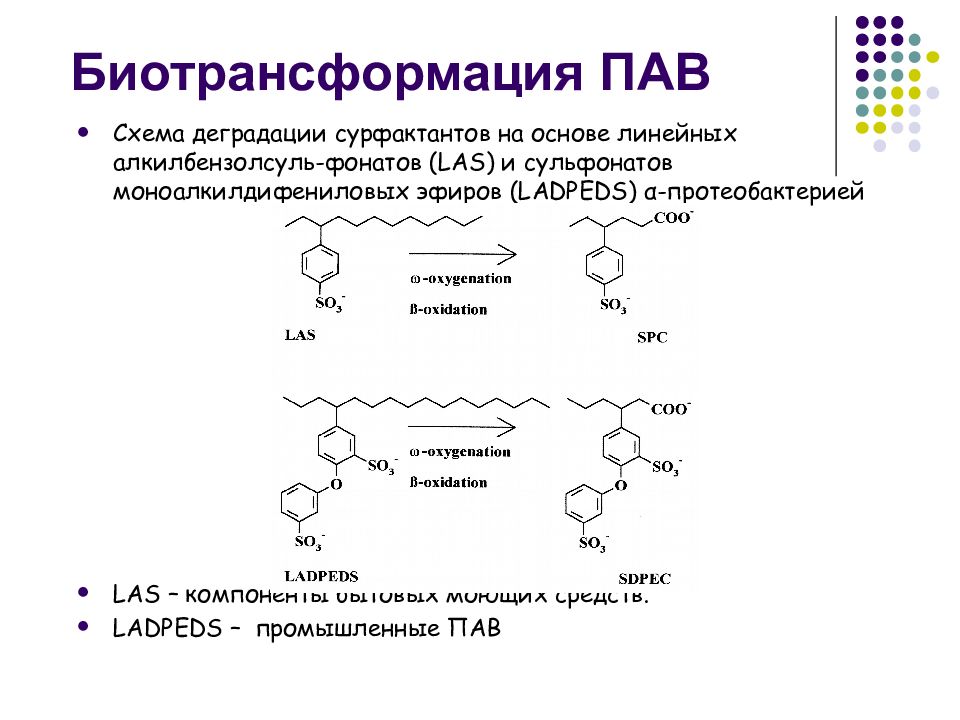 Схема деградации сурфактантов на основе линейных алкилбензолсуль-фонатов ( LAS ) и сульфонатов моноалкилдифениловых эфиров ( LADPEDS ) α-протеобактерией LAS – компоненты бытовых моющих средств. LADPEDS – промышленные ПАВ