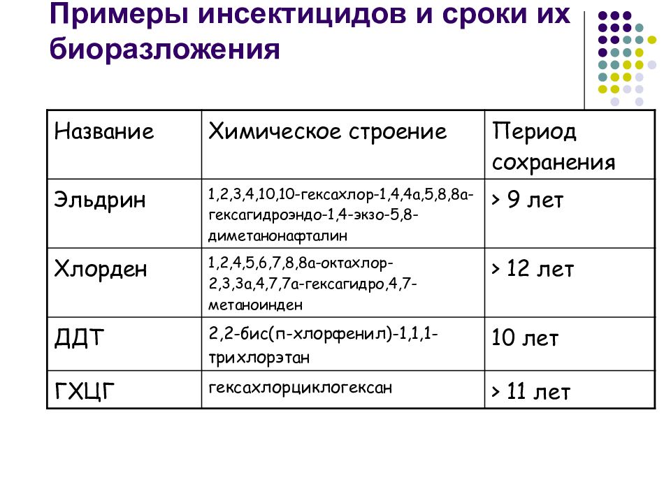 Слайд 27: Примеры инсектицидов и сроки их биоразложения