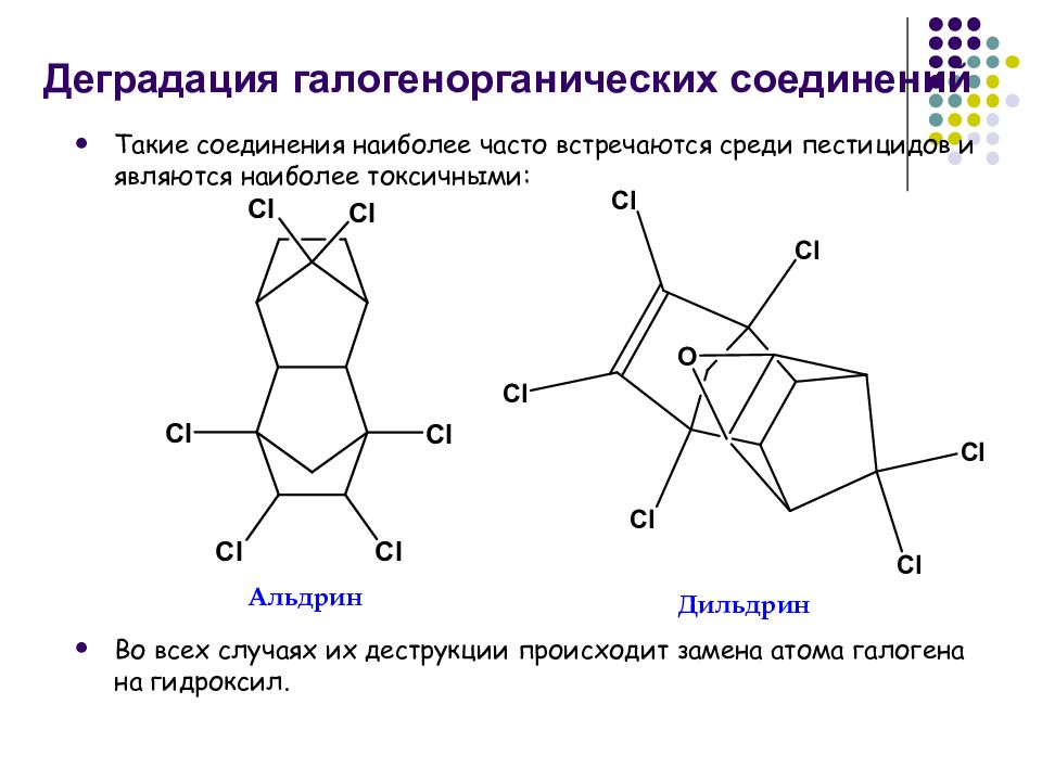 Такие соединения наиболее часто встречаются среди пестицидов и являются наиболее токсичными: Во всех случаях их деструкции происходит замена атома галогена на гидроксил. Альдрин Дильдрин