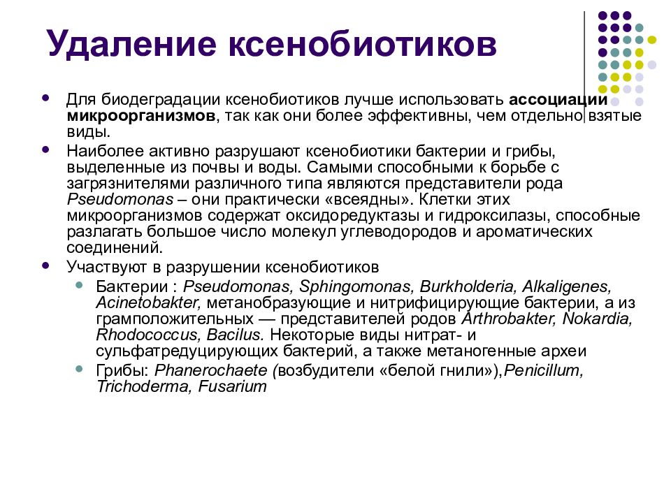 Для биодеградации ксенобиотиков лучше использовать ассоциации микроорганизмов, так как они более эффективны, чем отдельно взятые виды. Наиболее активно разрушают ксенобиотики бактерии и грибы, выделенные из почвы и воды. Самыми способными к борьбе с загрязнителями различного типа являются представители рода Pseudomonas – они практически «всеядны». Клетки этих микроорганизмов содержат оксидоредуктазы и гидроксилазы, способные разлагать большое число молекул углеводородов и ароматических соединений. Участвуют в разрушении ксенобиотиков Бактерии : Pseudomonas, Sphingomonas, Burkholderia, Alkaligenes, Acinetobakter, метанобразующие и нитрифицирующие бактерии, а из грамположительных — представителей родов Arthrobakter, Nokardia, Rhodococcus, Bacilus. Некоторые виды нитрат- и сульфатредуцирующих бактерий, а также метаногенные археи Грибы: Phanerochaete ( возбудители «белой гнили»), Penicillum, Trichoderma, Fusarium Удаление ксенобиотиков