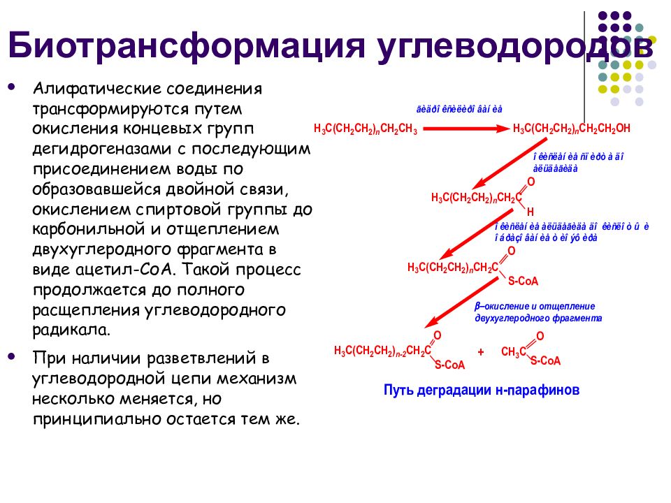 Алифатические соединения трансформируются путем окисления концевых групп дегидрогеназами с последующим присоединением воды по образовавшейся двойной связи, окислением спиртовой группы до карбонильной и отщеплением двухуглеродного фрагмента в виде ацетил-СоА. Такой процесс про дол жается до полного расщепления углеводородного радикала. При наличии разветвлений в углеводородной цепи механизм несколько меняется, но принципиально остается тем же.