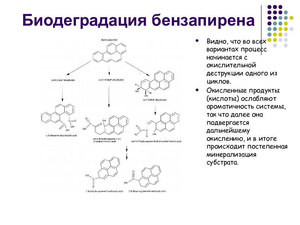 Видно, что во всех вариантах процесс начинается с окислительной деструкции одного из циклов. Окисленные продукты (кислоты) ослабляют ароматичность системы, так что далее она подвергается дальнейшему окислению, и в итоге происходит постепенная минерализация субстрата.