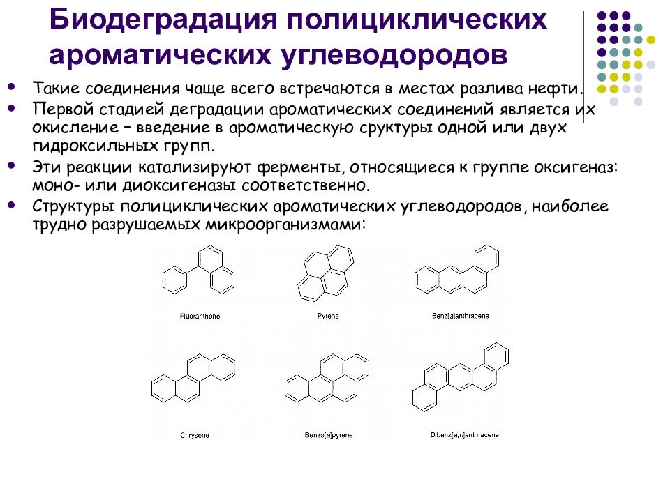 Такие соединения чаще всего встречаются в местах разлива нефти. Первой стадией деградации ароматических соединений является их окисление – введение в ароматическую сруктуры одной или двух гидроксильных групп. Эти реакции катализируют ферменты, относящиеся к группе оксигеназ: моно- или диоксигеназы соответственно. Структуры полициклических ароматических углеводородов, наиболее трудно разрушаемых микроорганизмами:
