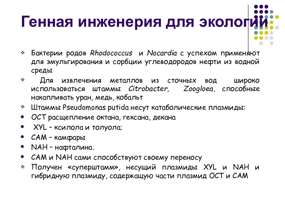 Бактерии родов Rhodococcus и Nocardia с успехом применяют для эмульгирования и сорбции углеводородов нефти из водной среды Для извлечения металлов из сточных вод широко использоваться штаммы Citrobacter, Zoogloea, способные накапливать уран, медь, кобальт Штаммы Pseudomonas putida несут катаболические плазмиды: OCT расщепление октана, гексана, декана XYL – ксилола и толуола; CAM – камфары NAH – нафталина. CAM и NAH сами способствуют своему переносу Получен «суперштамм», несущий плазмиды XYL и NAH и гибридную плазмиду, содержащую части плазмид OCT и CAM
