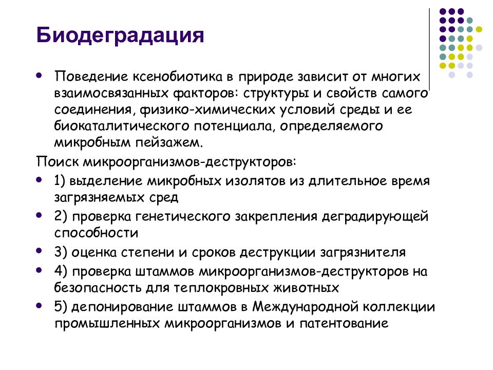 Поведение ксенобиотика в природе зависит от многих взаимосвязанных факторов: структуры и свойств самого соединения, физико-химических условий среды и ее биокаталитического потенциала, определяемого микробным пейзажем. Поиск микроорганизмов-деструкторов: 1) выделение микробных изолятов из длительное время загрязняемых сред 2) проверка генетического закрепления деградирующей способности 3) оценка степени и сроков деструкции загрязнителя 4) проверка штаммов микроорганизмов-деструкторов на безопасность для теплокровных животных 5) депонирование штаммов в Международной коллекции промышленных микроорганизмов и патентование
