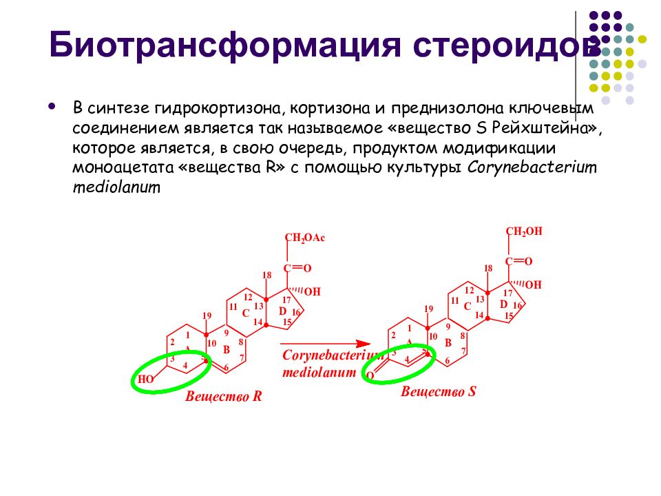 В синтезе гидрокортизона, кортизона и преднизолона ключевым соединением является так называемое «вещество S Рейхштейна», которое является, в свою очередь, продуктом модификации моноацетата «вещества R » с помощью культуры Corynebacterium mediolanum Биотрансформация стероидов