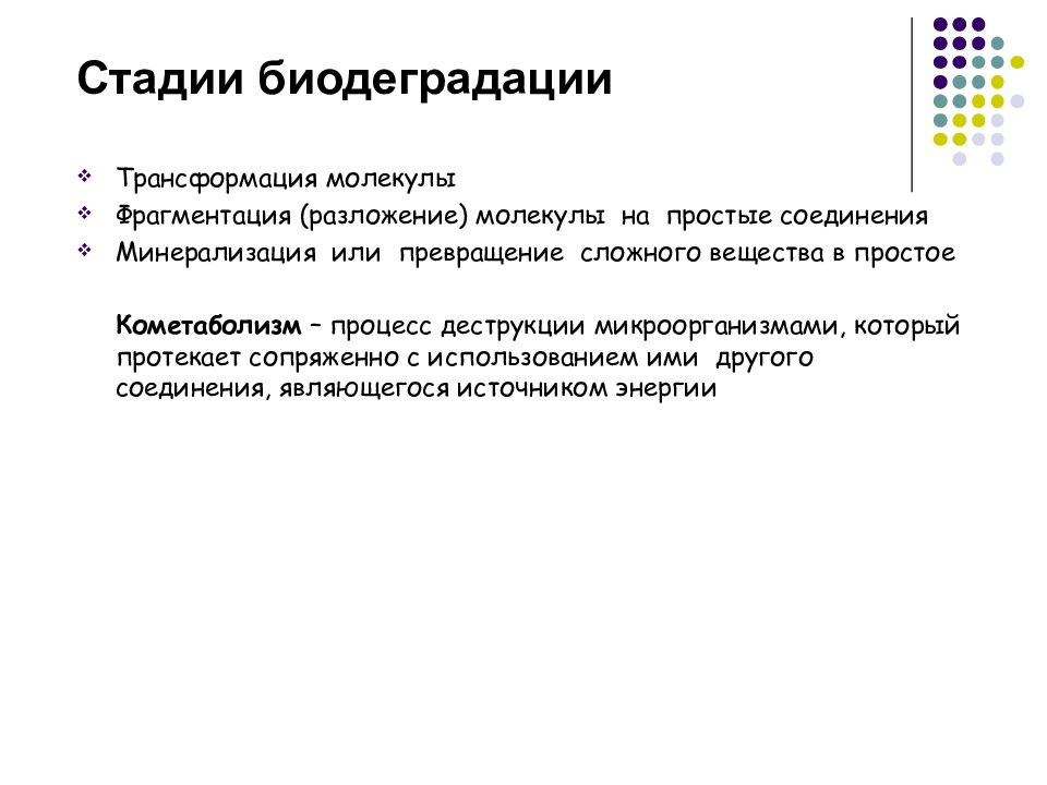Трансформация молекулы Фрагментация (разложение) молекулы на простые соединения Минерализация или превращение сложного вещества в простое Кометаболизм – процесс деструкции микроорганизмами, который протекает сопряженно с использованием ими другого соединения, являющегося источником энергии