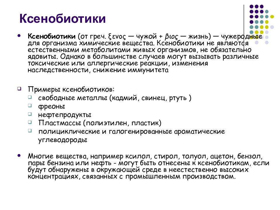 (от греч. ξενος — чужой + βιος — жизнь) — чужеродные для организма химические вещества. Ксенобиотики не являются естественными метаболитами живых организмов, не обязательно ядовиты. Однако в большинстве случаев могут вызывать различные токсические или аллергические реакции, изменения наследственности, снижение иммунитета Примеры ксенобиотиков: свободные металлы (кадмий, свинец, ртуть ) фреоны нефтепродукты Пластмассы (полиэтилен, пластик) полициклические и галогенированные ароматические углеводороды Многие вещества, например ксилол, стирол, толуол, ацетон, бензол, пары бензина или нефть - могут быть отнесены к ксенобиотикам, если будут обнаружены в окружающей среде в неестественно высоких концентрациях, связанных с промышленным производством. Ксенобиотики