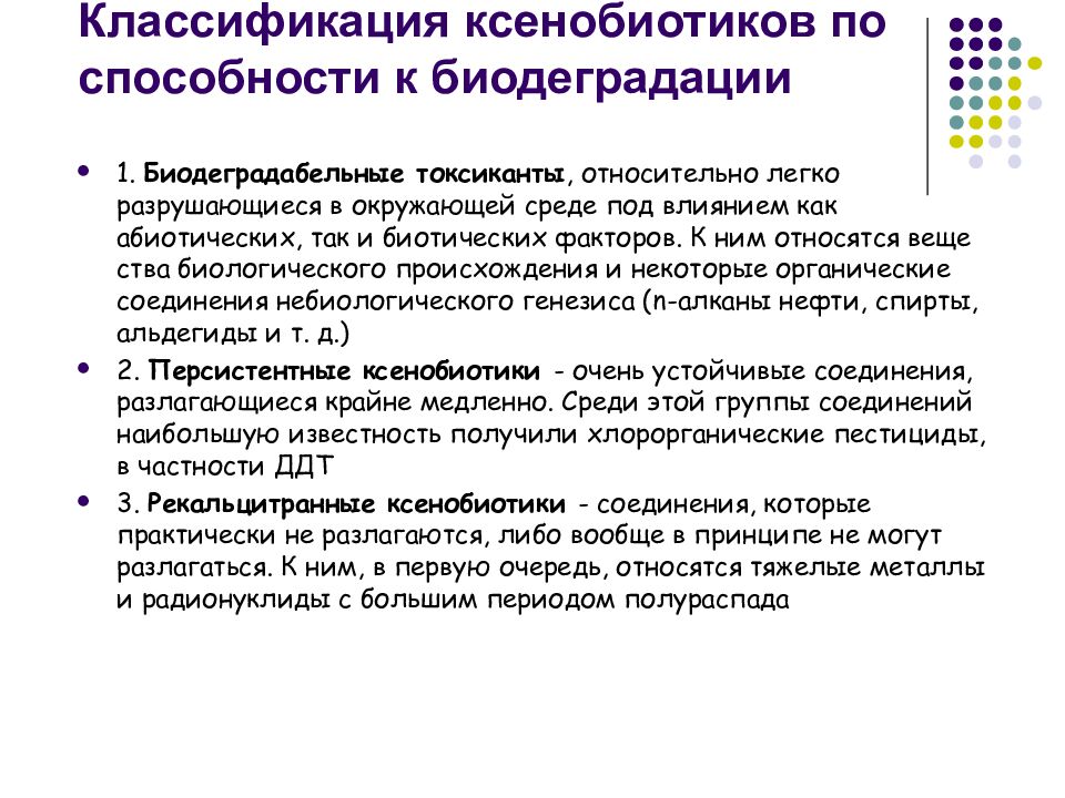 1. Биодеградабельные токсиканты, относительно легко разрушающиеся в окружающей среде под влиянием как абиотических, так и биотических факторов. К ним относятся вещества биологического происхождения и некоторые органические соединения небиологического генезиса (n-алканы нефти, спирты, альдегиды и т. д.) 2. Персистентные ксенобиотики - очень устойчивые соединения, разлагающиеся крайне медленно. Среди этой группы соединений наибольшую известность получили хлорорганические пестициды, в частности ДДТ 3. Рекальцитранные ксенобиотики - соединения, которые практически не разлагаются, либо вообще в принципе не могут разлагаться. К ним, в первую очередь, относятся тяжелые металлы и радионуклиды с большим периодом полураспада