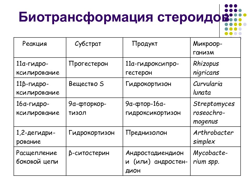 Реакция Субстрат Продукт Микроор-ганизм 11α-гидро-ксилирование Прогестерон 11α-гидроксипро-гестерон Rhizopus nigricans 11β-гидро-ксилирование Вещество S Гидрокортизон Curvularia lunata 16α-гидро-ксилирование 9 α -фторкор-тизол 9 α -фтор-16α-гидроксикортизон Streptomyces roseochro-mogenus 1,2-дегидри-рование Гидрокортизон Преднизолон Arthrobacter simplex Расщепление боковой цепи β-ситостерин Андростадиендион и (или) андростен-дион Mycobacte-rium spp.