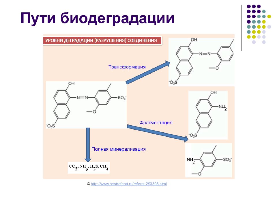 Биодеградация ПАВ начинается с сульфонатной группы (если R от 1 до 3 ) или с боковой цепи (при R> 3) Сложных ароматических и гетероциклических соединений (красителей, фармпрепаратов) с разрыва индольного кольца Гетероциклические соединения сначала окисляются, а потом происходит разрыв кольца (легче разрушаются азот- и кислородсодержащие гетероциклические соединения, чем серосодержащие вещества) Полимерные соединения за счет разрастания грибов на микротрещинах и последующего воздействия их фрментов и кислот (повышенной устойчивостью обладают полиэтилен, полипропилен, полистирол, жесткий поливинилхлорид, полиамид, полимерные смолы) © http://www.goinggreensolutions.com.au/wp/wp-content/uploads/2013/08/biodegradable1.jpg