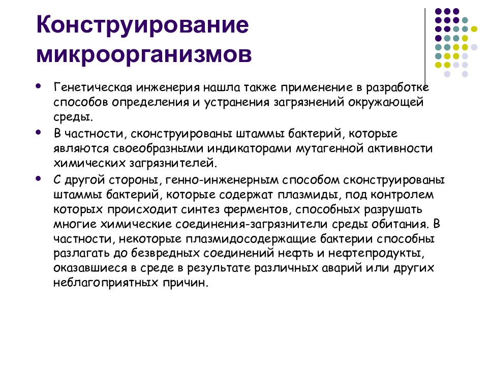 Генетическая инженерия нашла также применение в разработке способов определения и устранения загрязнений окружающей среды. В частности, сконструированы штаммы бактерий, которые являются своеобразными индикаторами мутагенной активности химических загрязнителей. С другой стороны, генно-инженерным способом сконструированы штаммы бактерий, которые содержат плазмиды, под контролем которых происходит синтез ферментов, способных разрушать многие химические соединения-загрязнители среды обитания. В частности, некоторые плазмидосодержащие бактерии способны разлагать до безвредных соединений нефть и нефтепродукты, оказавшиеся в среде в результате различных аварий или других неблагоприятных причин. Конструирование микроорганизмов