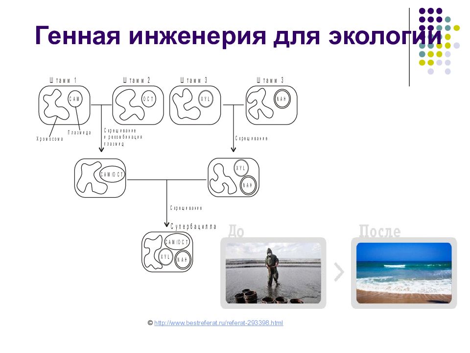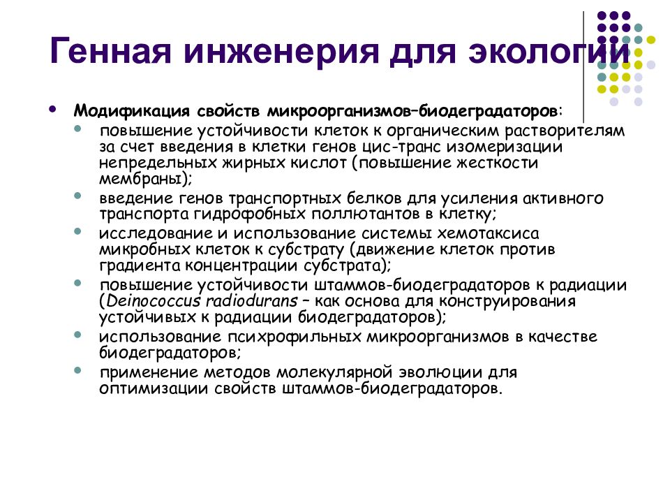 Модификация свойств микроорганизмов–биодеградаторов : повышение устойчивости клеток к органическим растворителям за счет введения в клетки генов цис-транс изомеризации непредельных жирных кислот (повышение жесткости мембраны); введение генов транспортных белков для усиления активного транспорта гидрофобных поллютантов в клетку; исследование и использование системы хемотаксиса микробных клеток к субстрату (движение клеток против градиента концентрации субстрата); повышение устойчивости штаммов-биодеградаторов к радиации ( Deinococcus radiodurans – как основа для конструирования устойчивых к радиации биодеградаторов); использование психрофильных микроорганизмов в качестве биодеградаторов; применение методов молекулярной эволюции для оптимизации свойств штаммов-биодеградаторов. Генная инженерия для экологии