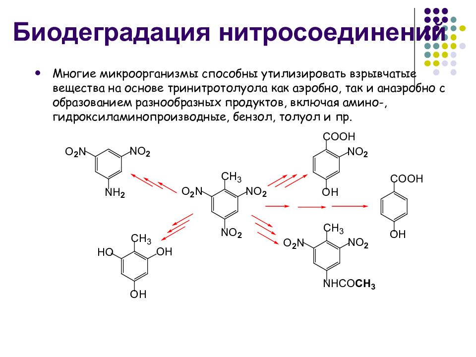 Многие микроорганизмы способны утилизировать взрывчатые вещества на основе тринитротолуола как аэробно, так и анаэробно с образованием разнообразных продуктов, включая амино-, гидроксиламинопроизводные, бензол, толуол и пр.