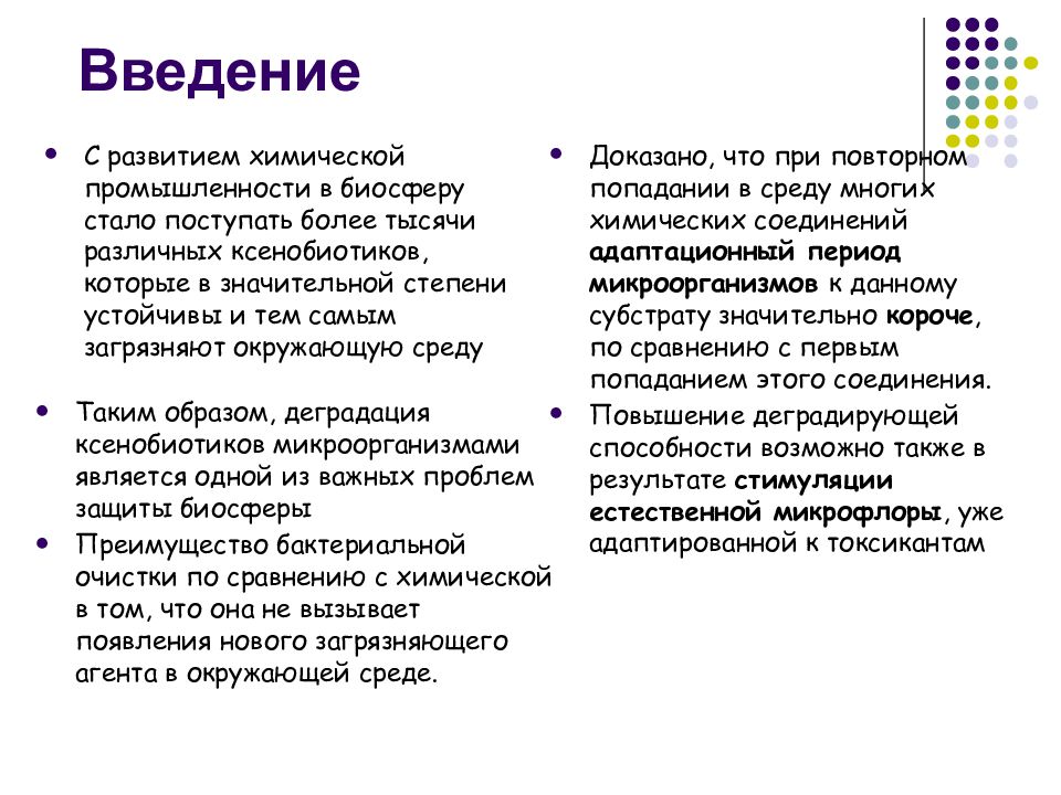 С развитием химической промышленности в биосферу стало поступать более тысячи различных ксенобиотиков, которые в значительной степени устойчивы и тем самым загрязняют окружающую среду Доказано, что при повторном попадании в среду многих химических соединений адаптационный период микроорганизмов к данному субстрату значительно короче, по сравнению с первым попаданием этого соединения. Повышение деградирующей способности возможно также в результате стимуляции естественной микрофлоры, уже адаптированной к токсикантам Таким образом, деградация ксенобиотиков микроорганизмами является одной из важных проблем защиты биосферы Преимущество бактериальной очистки по сравнению с химической в том, что она не вызывает появления нового загрязняющего агента в окружающей среде. Введение