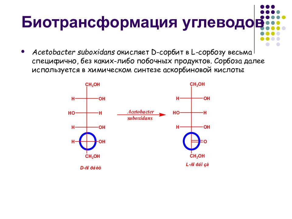 Acetobacter suboxidans окисляет D -сорбит в L- сорбозу весьма специфично, без каких-либо побочных продуктов. Сорбоза далее используется в химическом синтезе аскорбиновой кислоты