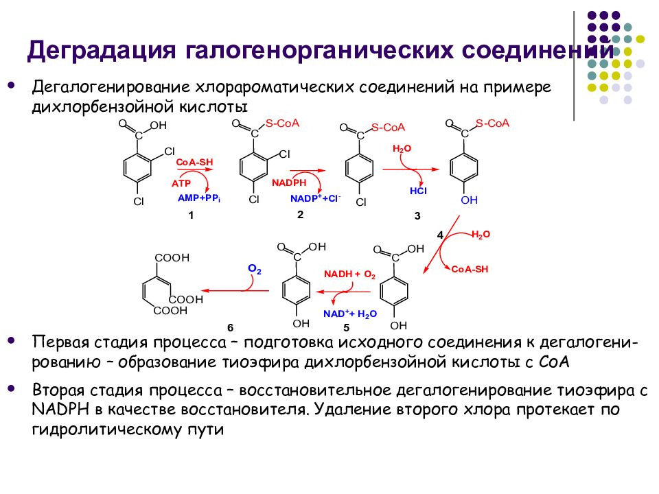 Дегалогенирование хлорароматических соединений на примере дихлорбензойной кислоты Первая стадия процесса – подготовка исходного соединения к дегалогени-рованию – образование тиоэфира дихлорбензойной кислоты с СоА Вторая стадия процесса – восстановительное дегалогенирование тиоэфира с NADPH в качестве восстановителя. Удаление второго хлора протекает по гидролитическому пути Деградация галогенорганических соединений