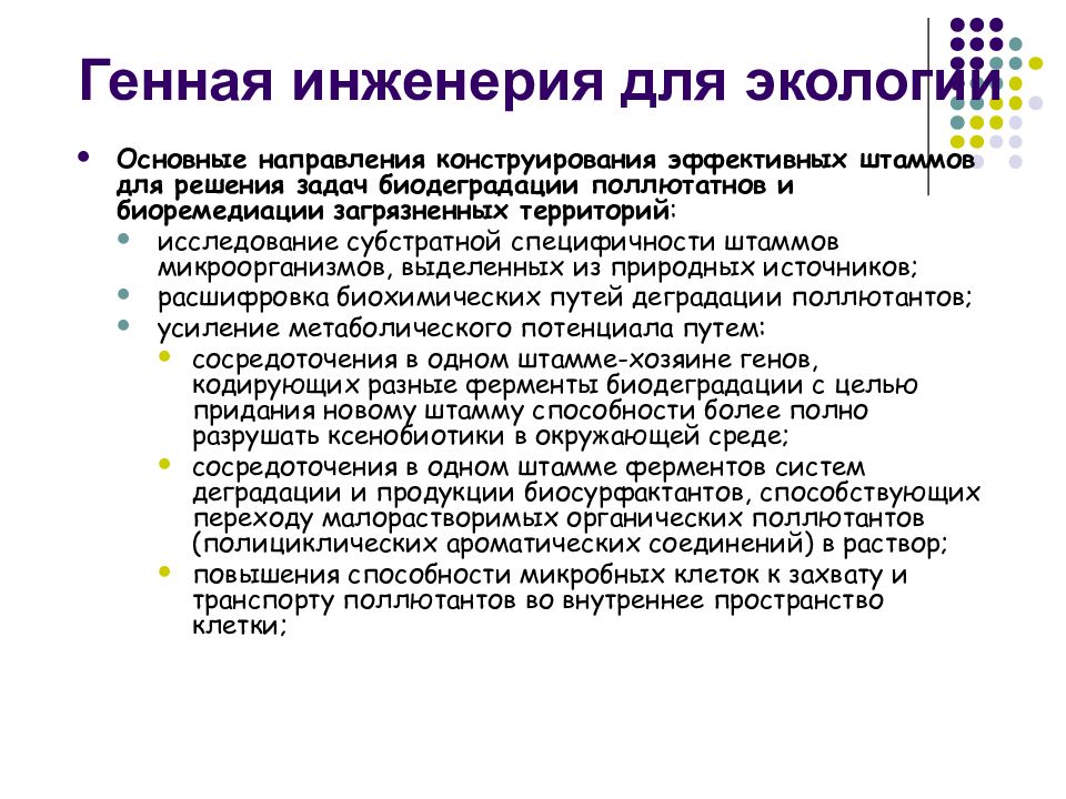 Основные направления конструирования эффективных штаммов для решения задач биодеградации поллютатнов и биоремедиации загрязненных территорий : исследование субстратной специфичности штаммов микроорганизмов, выделенных из природных источников; расшифровка биохимических путей деградации поллютантов; усиление метаболического потенциала путем: сосредоточения в одном штамме-хозяине генов, кодирующих разные ферменты биодеградации с целью придания новому штамму способности более полно разрушать ксенобиотики в окружающей среде; сосредоточения в одном штамме ферментов систем деградации и продукции биосурфактантов, способствующих переходу малорастворимых органических поллютантов (полициклических ароматических соединений) в раствор; повышения способности микробных клеток к захвату и транспорту поллютантов во внутреннее пространство клетки; Генная инженерия для экологии