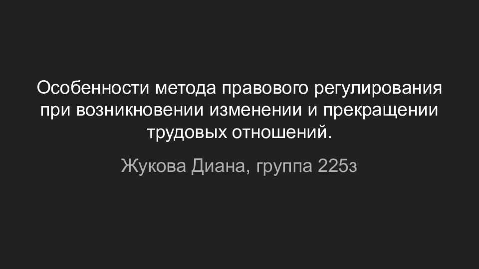 Первый слайд презентации: Особенности метода правового регулирования при возникновении изменении и прекращении трудовых отношений