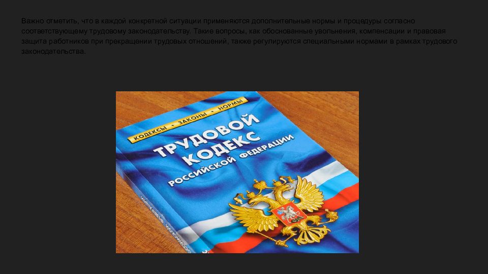 Важно отметить, что в каждой конкретной ситуации применяются дополнительные нормы и процедуры согласно соответствующему трудовому законодательству. Такие вопросы, как обоснованные увольнения, компенсации и правовая защита работников при прекращении трудовых отношений, также регулируются специальными нормами в рамках трудового законодательства.