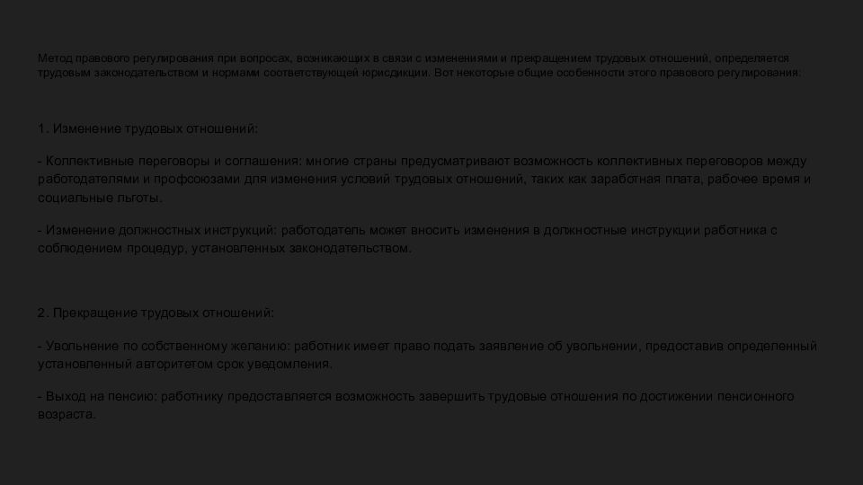 Слайд 2: Метод правового регулирования при вопросах, возникающих в связи с изменениями и прекращением трудовых отношений, определяется трудовым законодательством и нормами соответствующей юрисдикции. Вот некоторые общие особенности этого правового регулирования: