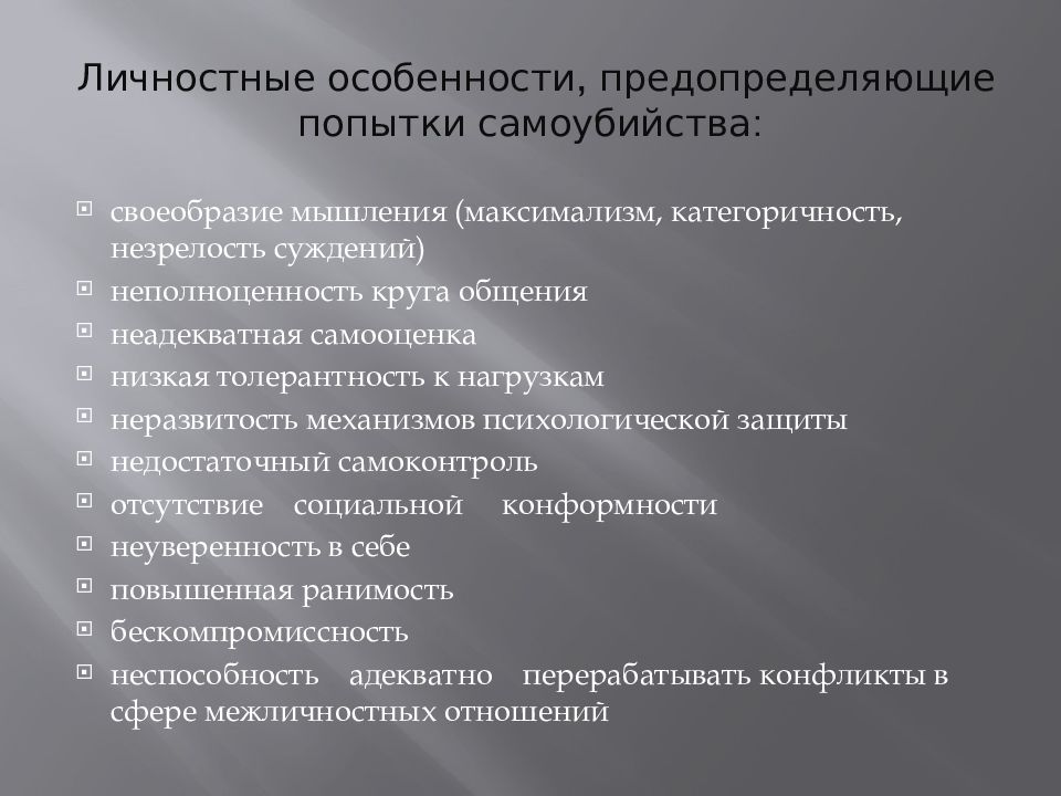 своеобразие мышления (максимализм, категоричность, незрелость суждений) неполноценность круга общения неадекватная самооценка низкая толерантность к нагрузкам неразвитость механизмов психологической защиты недостаточный самоконтроль отсутствие социальной конформности неуверенность в себе повышенная ранимость бескомпромиссность неспособность адекватно перерабатывать конфликты в сфере межличностных отношений