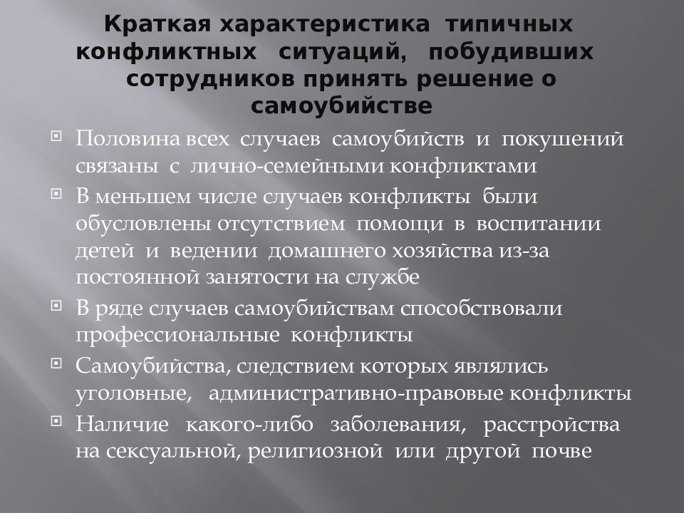 Половина всех случаев самоубийств и покушений связаны с лично-семейными конфликтами В меньшем числе случаев конфликты были обусловлены отсутствием помощи в воспитании детей и ведении домашнего хозяйства из-за постоянной занятости на службе В ряде случаев самоубийствам способствовали профессиональные конфликты Самоубийства, следствием которых являлись уголовные, административно-правовые конфликты Наличие какого-либо заболевания, расстройства на сексуальной, религиозной или другой почве