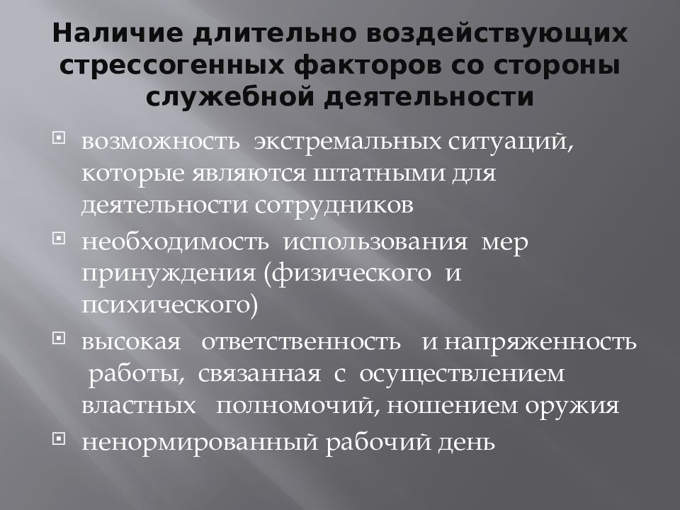 возможность экстремальных ситуаций, которые являются штатными для деятельности сотрудников необходимость использования мер принуждения (физического и психического) высокая ответственность и напряженность работы, связанная с осуществлением властных полномочий, ношением оружия ненормированный рабочий день