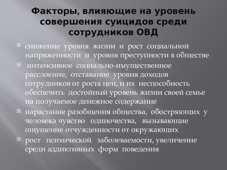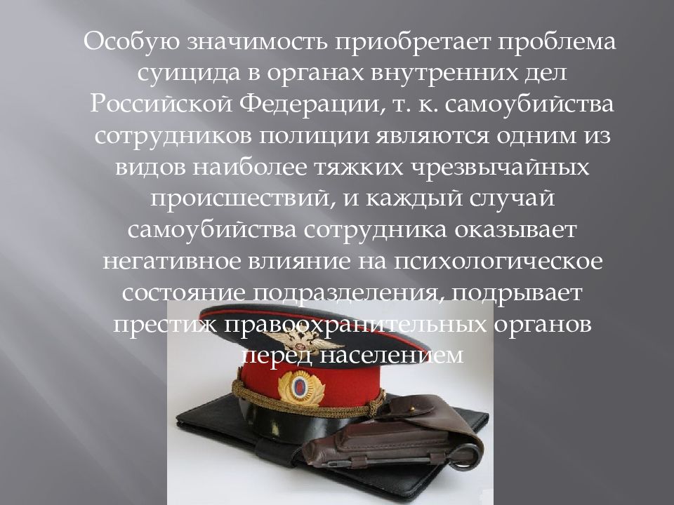 Особую значимость приобретает проблема суицида в органах внутренних дел Российской Федерации, т. к. самоубийства сотрудников полиции являются одним из видов наиболее тяжких чрезвычайных происшествий, и каждый случай самоубийства сотрудника оказывает негативное влияние на психологическое состояние подразделения, подрывает престиж правоохранительных органов перед населением