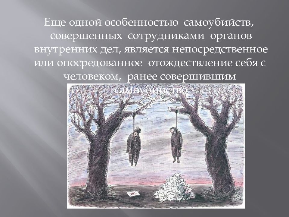 Еще одной особенностью самоубийств, совершенных сотрудниками органов внутренних дел, является непосредственное или опосредованное отождествление себя с человеком, ранее совершившим самоубийство