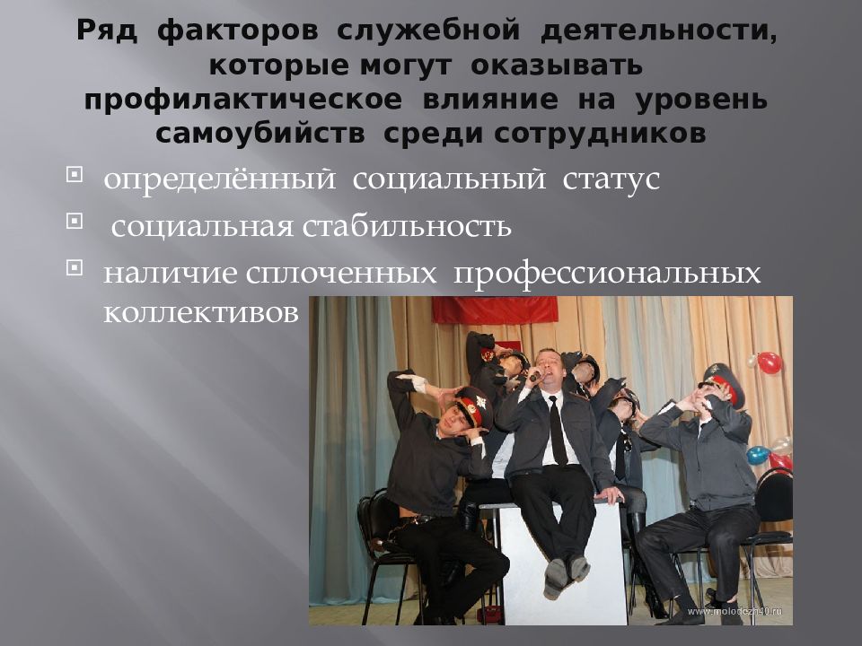 Слайд 17: Ряд факторов служебной деятельности, которые могут оказывать профилактическое влияние на уровень самоубийств среди сотрудников