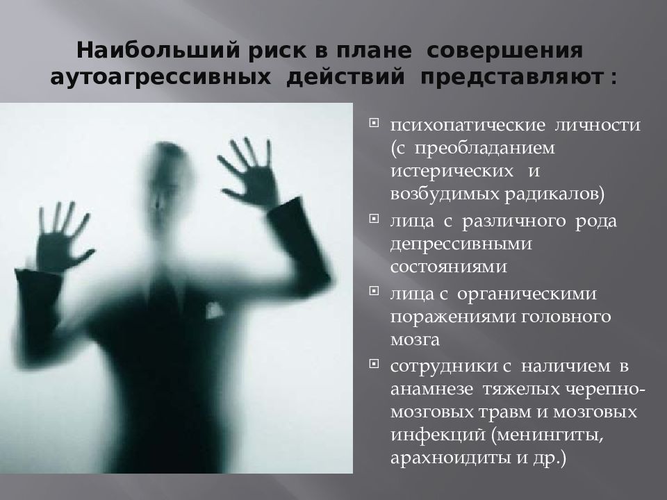 психопатические личности (с преобладанием истерических и возбудимых радикалов) лица с различного рода депрессивными состояниями лица с органическими поражениями головного мозга сотрудники с наличием в анамнезе тяжелых черепно-мозговых травм и мозговых инфекций (менингиты, арахноидиты и др.)