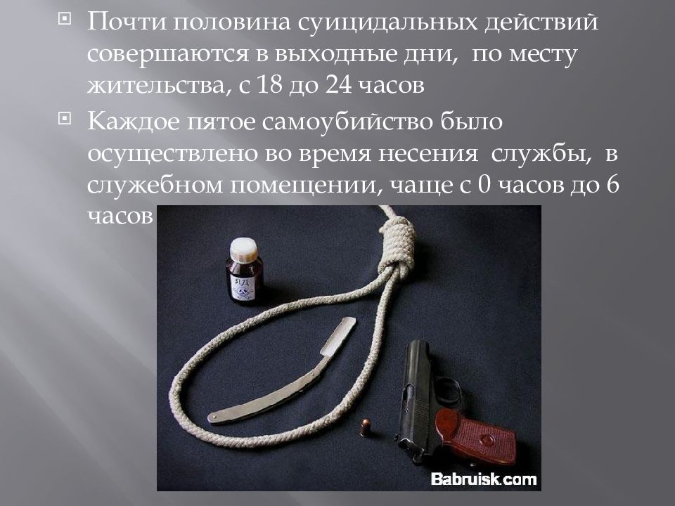 Почти половина суицидальных действий совершаются в выходные дни, по месту жительства, с 18 до 24 часов Каждое пятое самоубийство было осуществлено во время несения службы, в служебном помещении, чаще с 0 часов до 6 часов утра