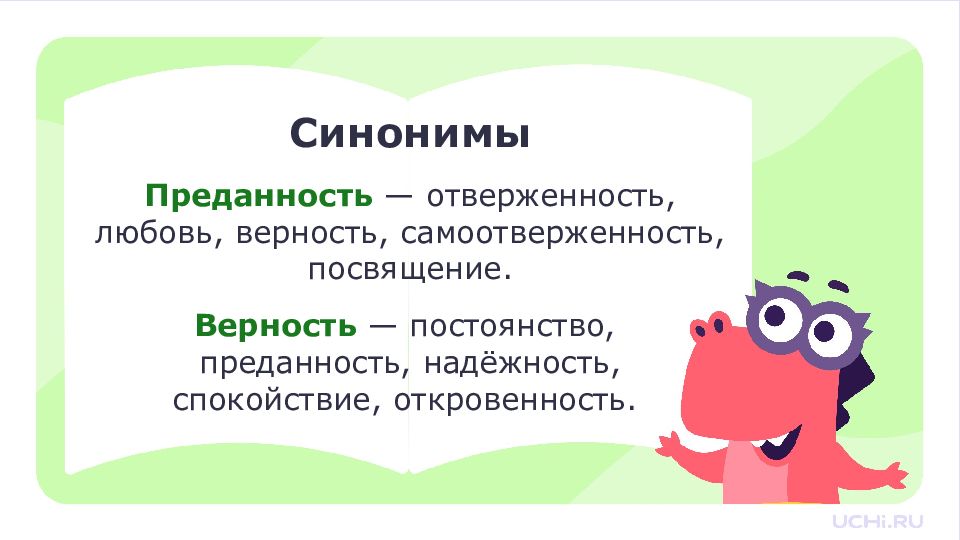 Синонимы П реданность — отверженность, любовь, верность, самоотверженность, посвящение. Верность — постоянство, преданность, надёжность, спокойствие, откровенность.